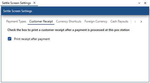 To always print a customer receipt after the order is settled when a payment is saved on the credit card or settle screen, set the Print receipt after payment checkbox in Back Office | Settings | Main Settings | Settle Screen.