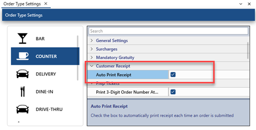 AmigoPOS can be configured to print the customer receipt automatically based on order type or other preferences, as follows: