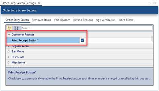 To automaitcally enable the print receipt button each time an order is started or recalled, set the Print Receipt By Default value to Yes in Back Office | Settings | Main Settings | Order Entry, as shown below. This value determines the state of the Print Receipt button each time an order is started or recalled.