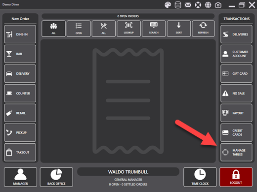 - Manage Tables: Select MANAGE TABLES from the main screen to open the seating chart in management mode. This mode displays the full navigation bar with access to Tables, Reservations, Waiting List, and Designer.