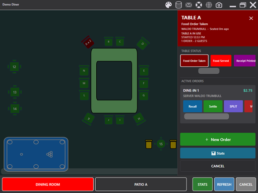 - New Order: When starting a new dine-in order, the seating chart is displayed so the server can select a table. Tapping an empty table immediately starts a new order. Tapping an occupied table displays the table action panel.