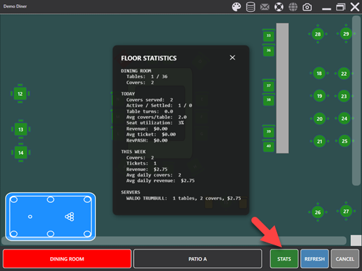- STATS: Opens the floor statistics overlay. This button is only visible if the Seating Chart Statistics permission is enabled.