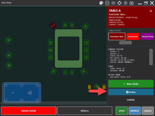 When a table is selected, a summary line is displayed below the table name showing the number of orders, guest count, order total, and time started. For more detailed statistics, tap the STATS button within the table action panel to view historical performance data for the selected table.