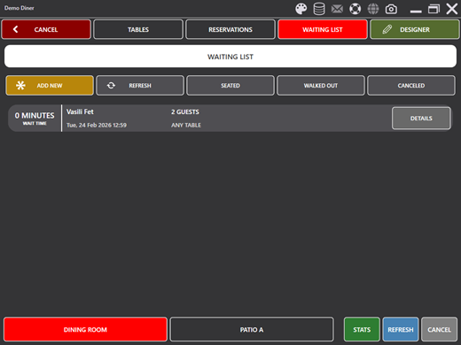 The waiting list operates similarly to reservations but is designed for walk-in guests. Tap WAITING LIST on the navigation bar to open the waiting list overlay.