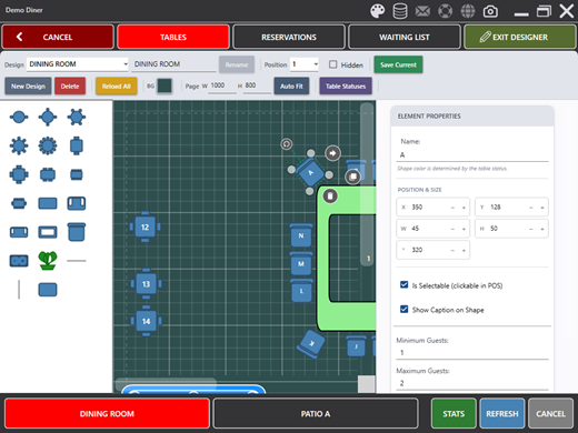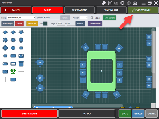 The floor plan designer allows you to create and edit room layouts using a drag & drop interface. To enter the designer, tap the DESIGNER button on the navigation bar. The button text changes to EXIT DESIGNER while in design mode. The DESIGNER button is only visible for job types that have the Seating Chart Designer permission enabled.