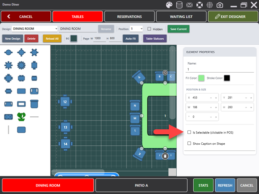 - Selectable: When checked, the table can be tapped to start a new order. Uncheck this for decorative elements such as walls, plants, and fixtures that should not be selectable.