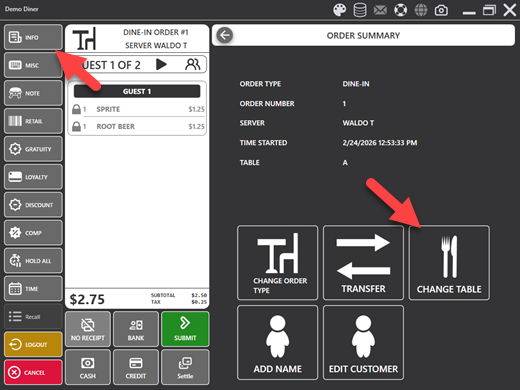 - Order Entry Screen: Press the CHANGE TABLE button to open the seating chart in table selection mode. Tap the desired table to reassign the order.